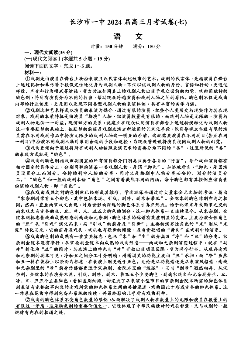 湖南省长沙市第一中学2024届高三下学期月考(七)语文