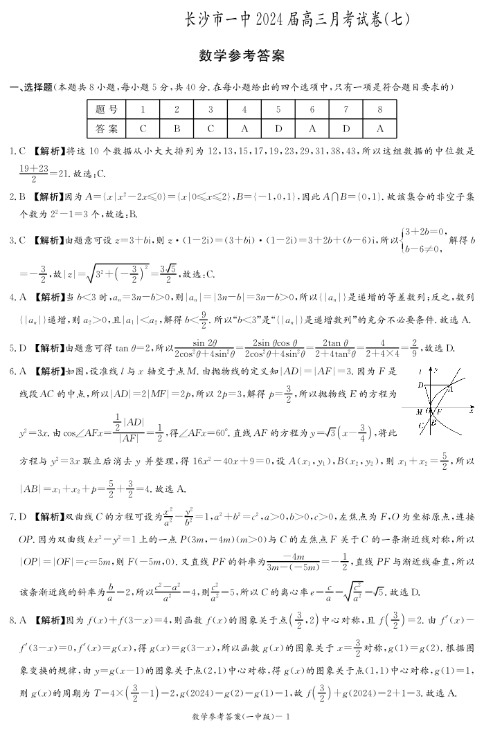 湖南省长沙市第一中学2024届高三下学期月考(七)数学答案