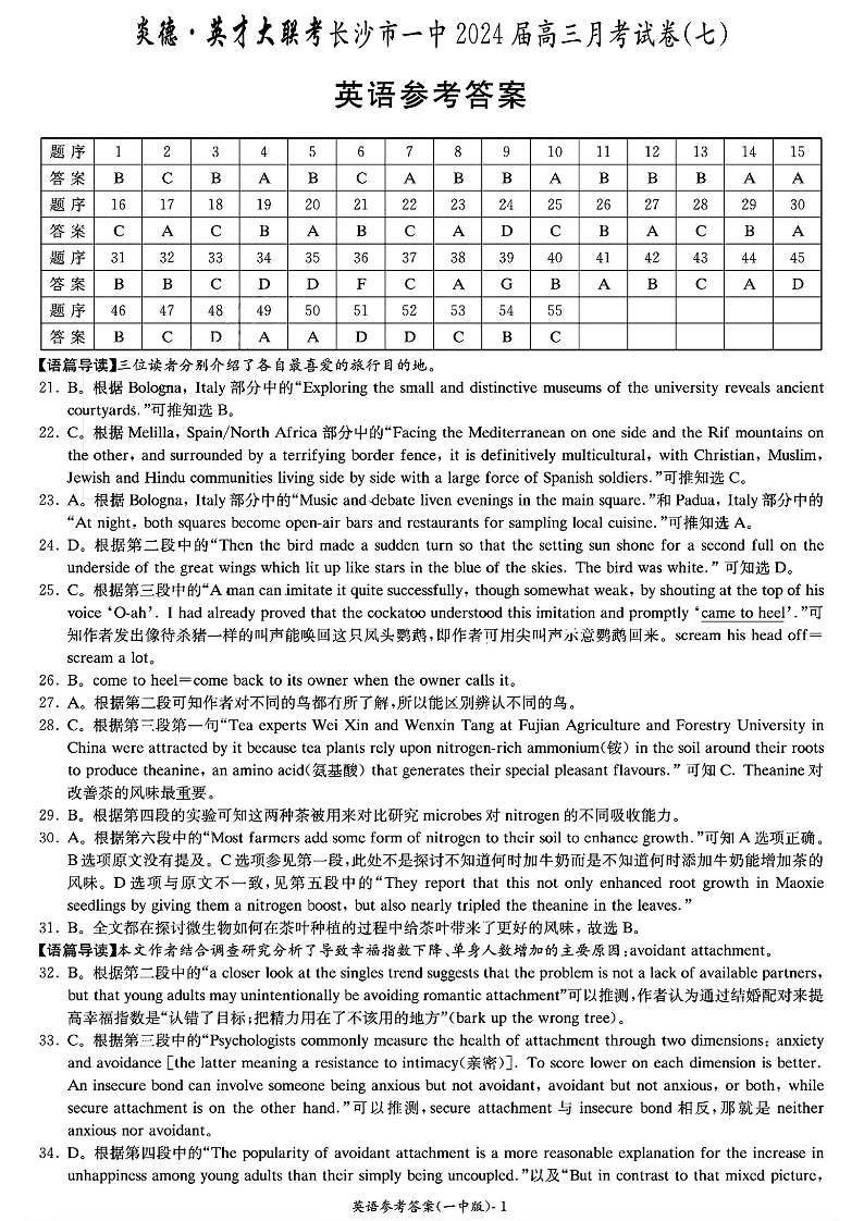 湖南省长沙市第一中学2024届高三下学期月考(七)英语答案