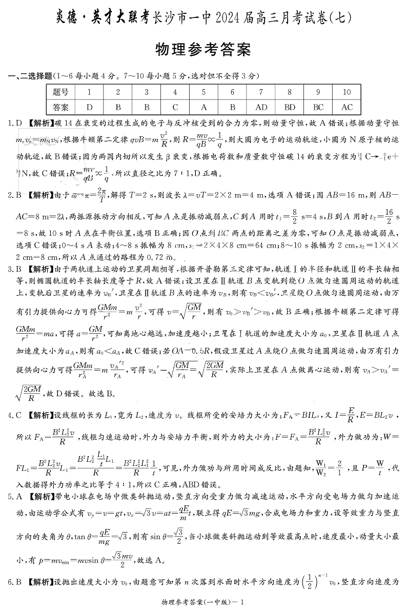 湖南省长沙市第一中学2024届高三下学期月考(七)物理答案