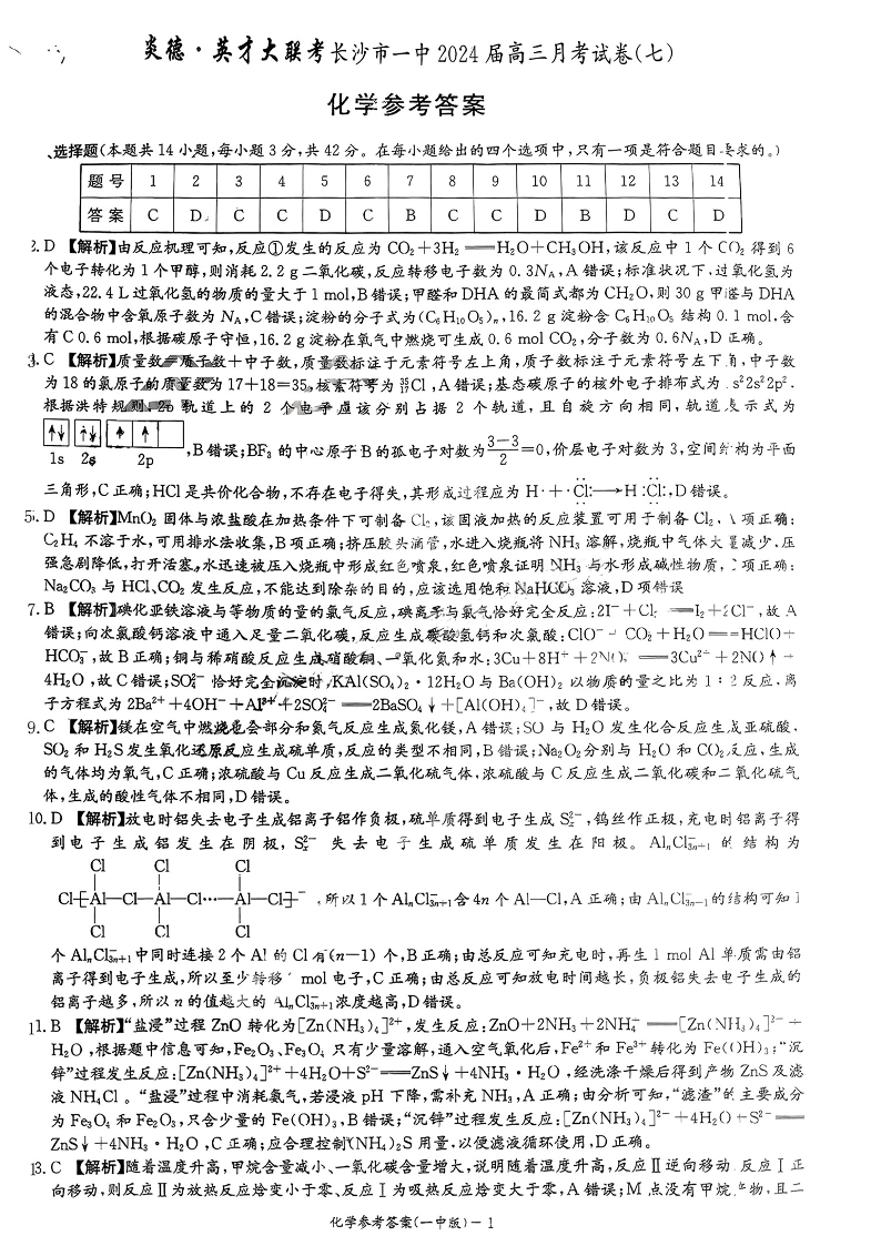 湖南省长沙市第一中学2024届高三下学期月考(七)化学答案