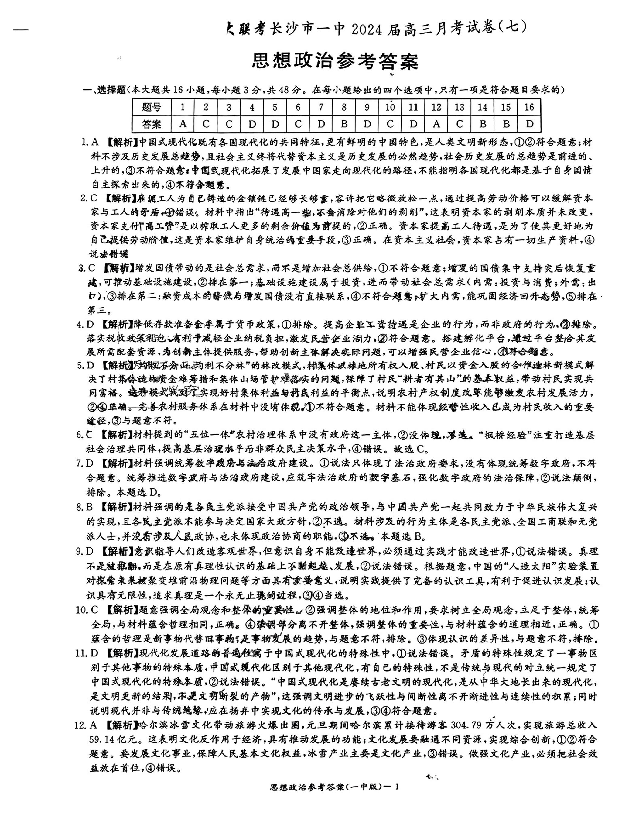 湖南省长沙市第一中学2024届高三下学期月考(七)政治答案