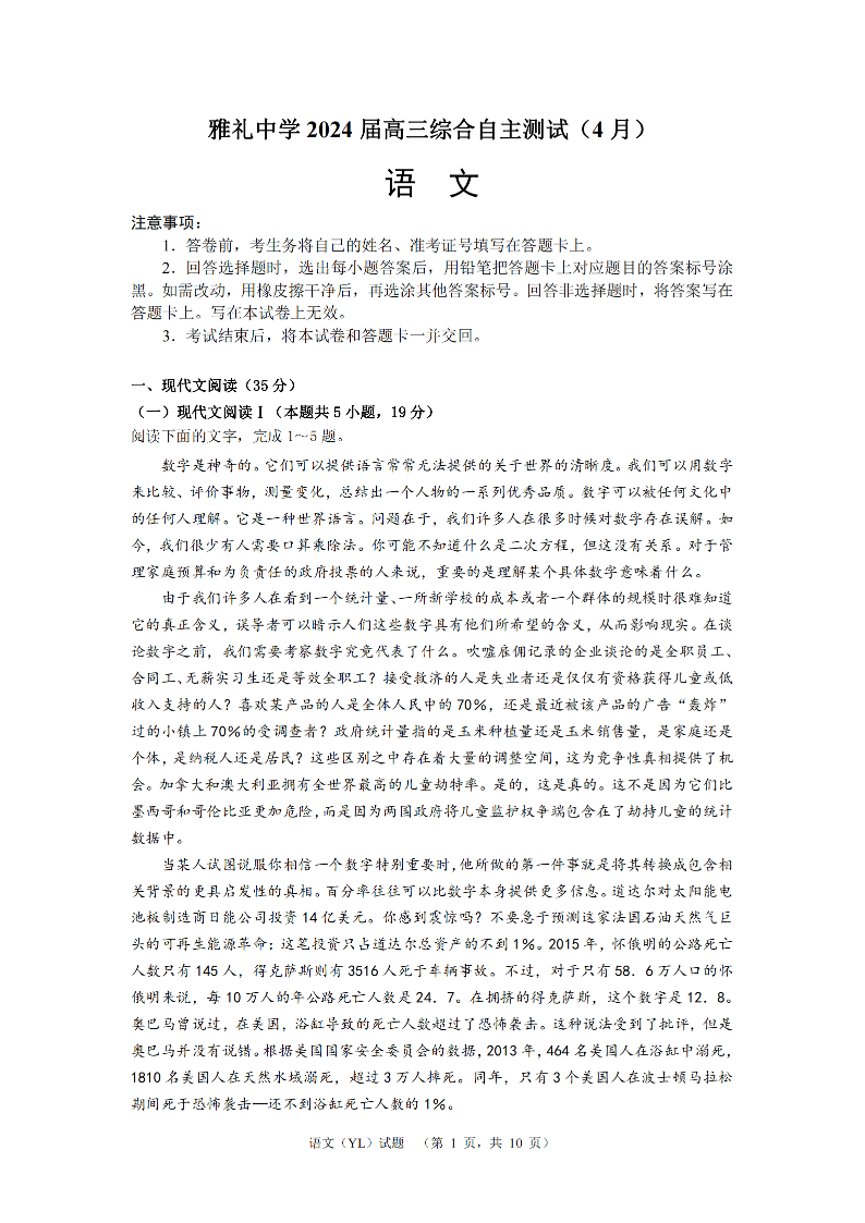 湖南省长沙市雅礼中学2024届高三4月综合测试语文