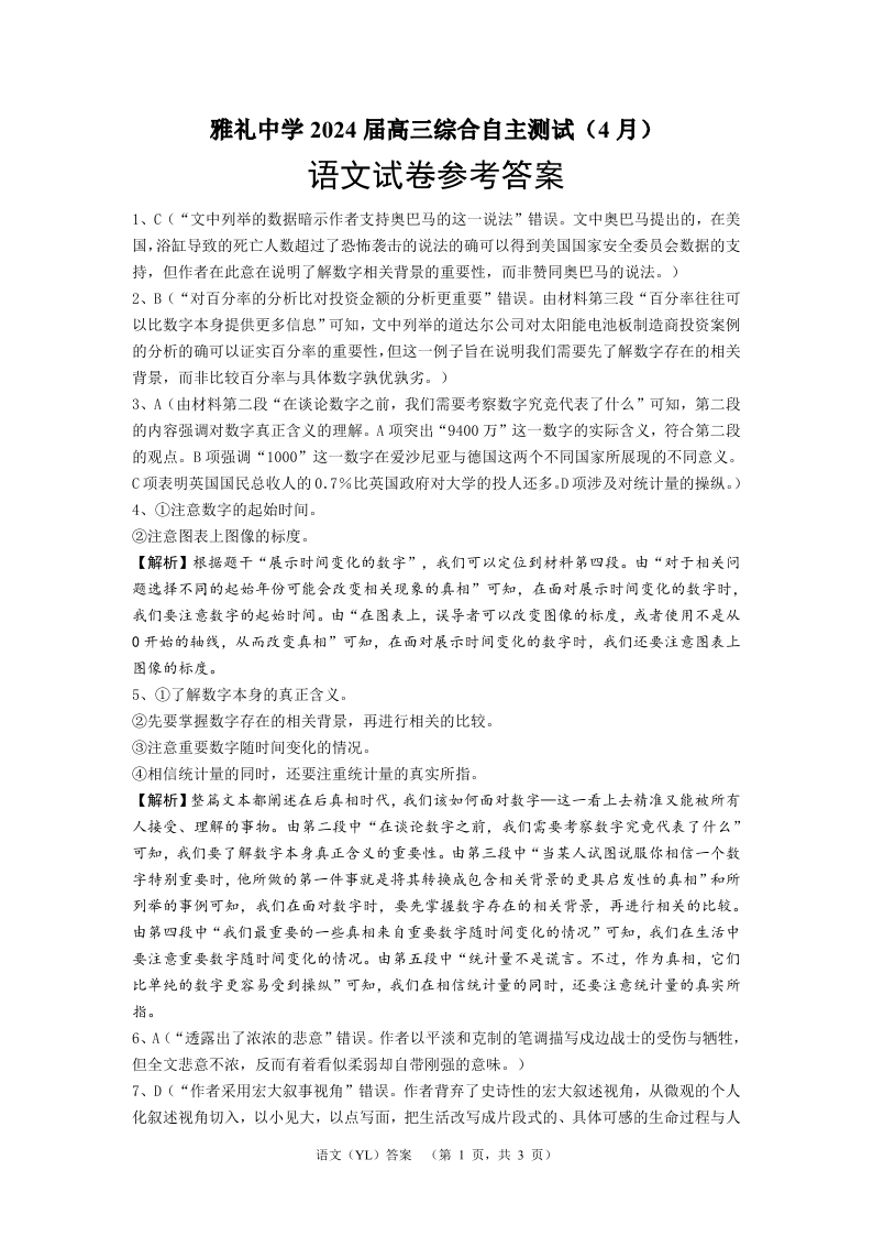 湖南省长沙市雅礼中学2024届高三4月综合测试语文答案