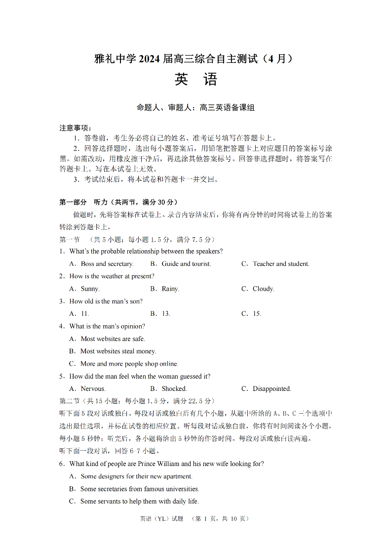 湖南省长沙市雅礼中学2024届高三4月综合测试英语+答案
