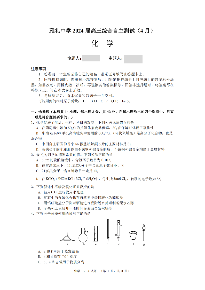 湖南省长沙市雅礼中学2024届高三4月综合测试化学+答案