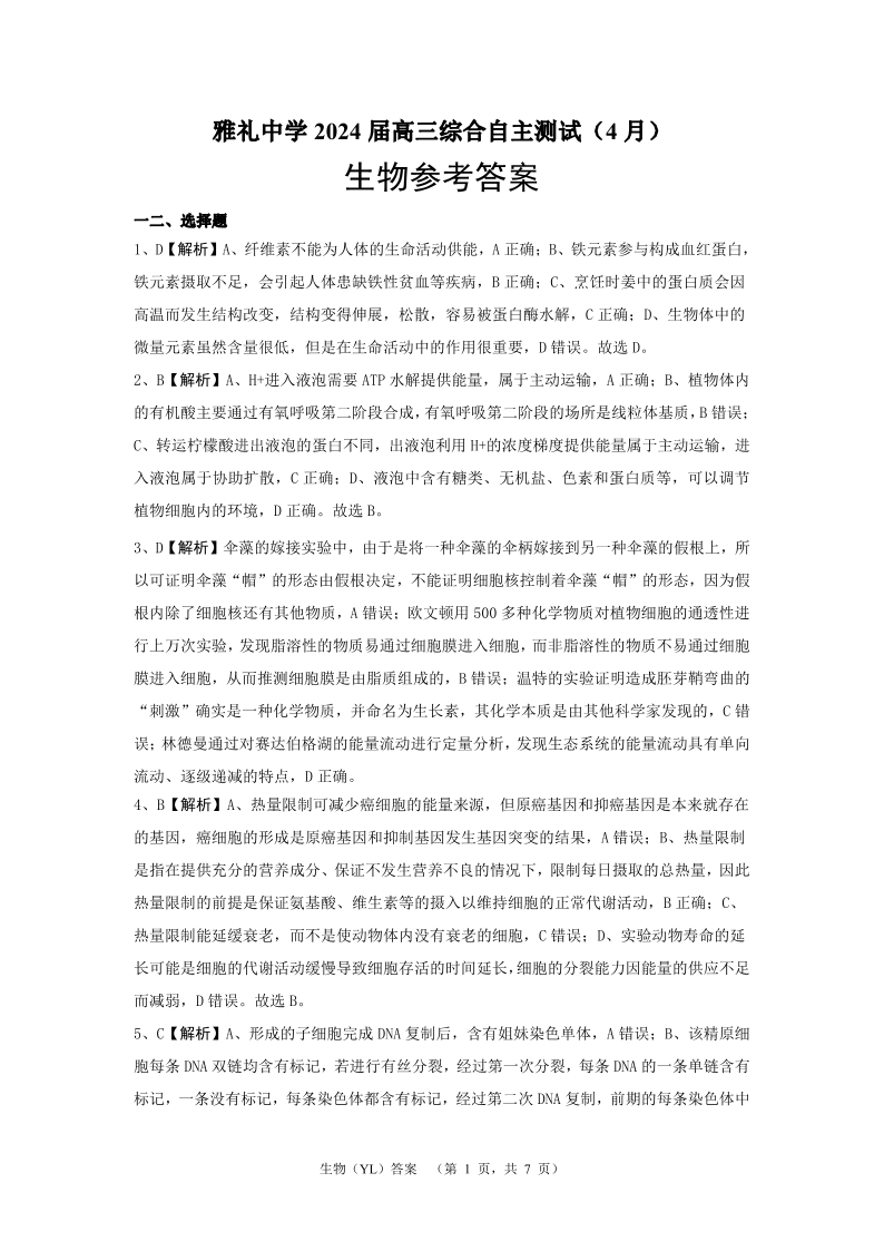 湖南省长沙市雅礼中学2024届高三4月综合测试生物答案