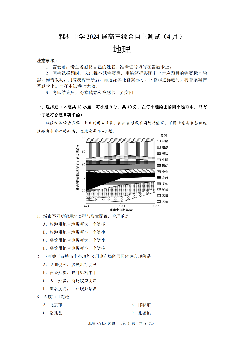 湖南省长沙市雅礼中学2024届高三4月综合测试地理+答案