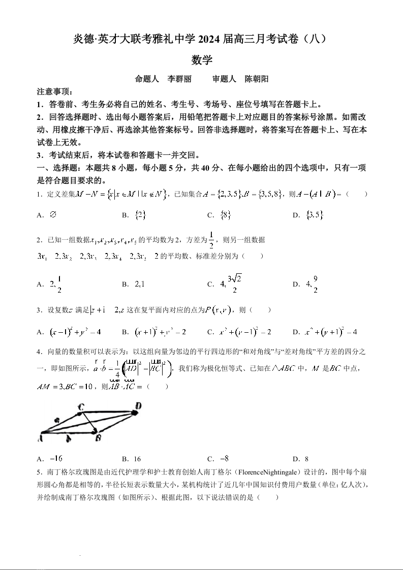 湖南省长沙市雅礼中学2024届高三下学期月考(八)数学+答案