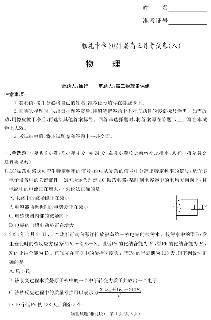 湖南省长沙市雅礼中学2024届高三下学期月考(八)物理