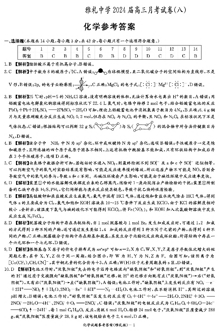 湖南省长沙市雅礼中学2024届高三下学期月考(八)化学答案
