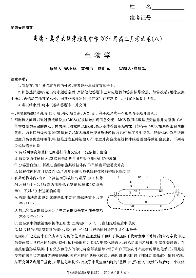 湖南省长沙市雅礼中学2024届高三下学期月考(八)生物