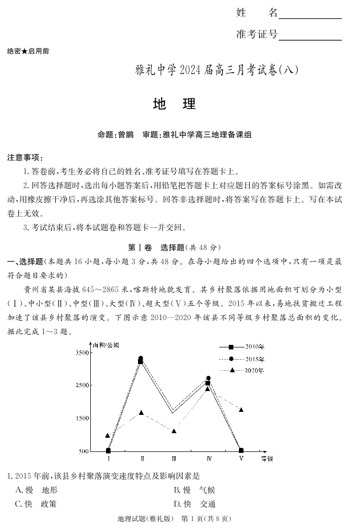 湖南省长沙市雅礼中学2024届高三下学期月考(八)地理