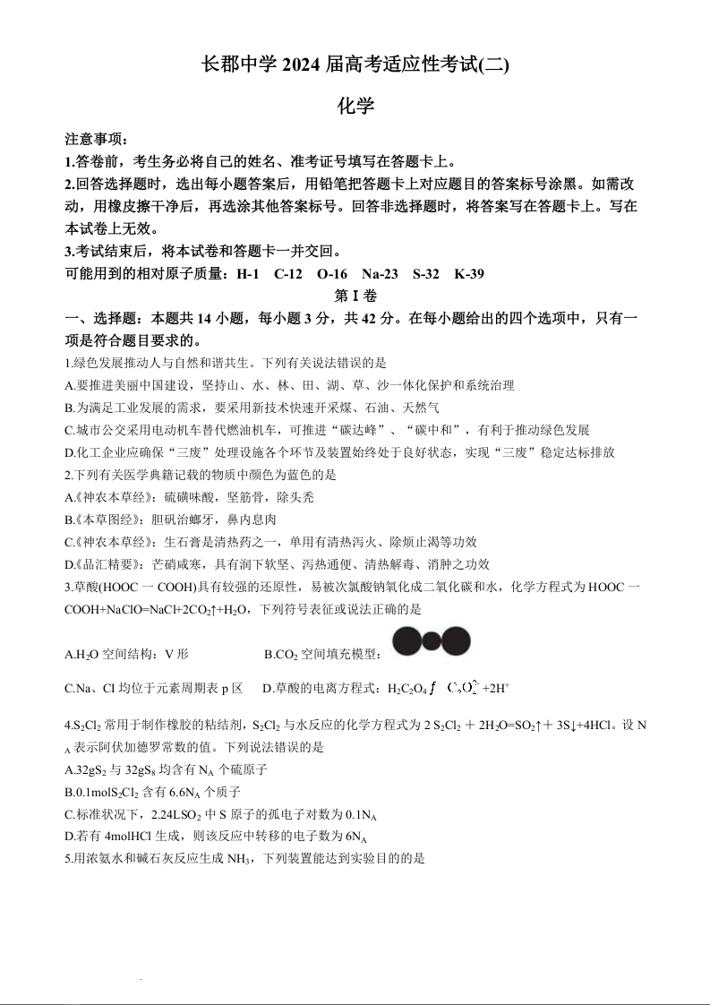 湖南省长沙市长郡中学2024届高三适应考试(二)化学+答案