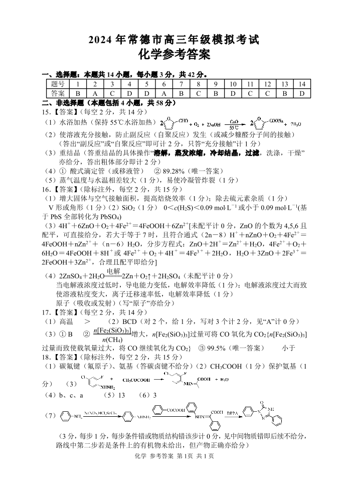 湖南省常德市2024届高三下学期3月模拟考试化学答案