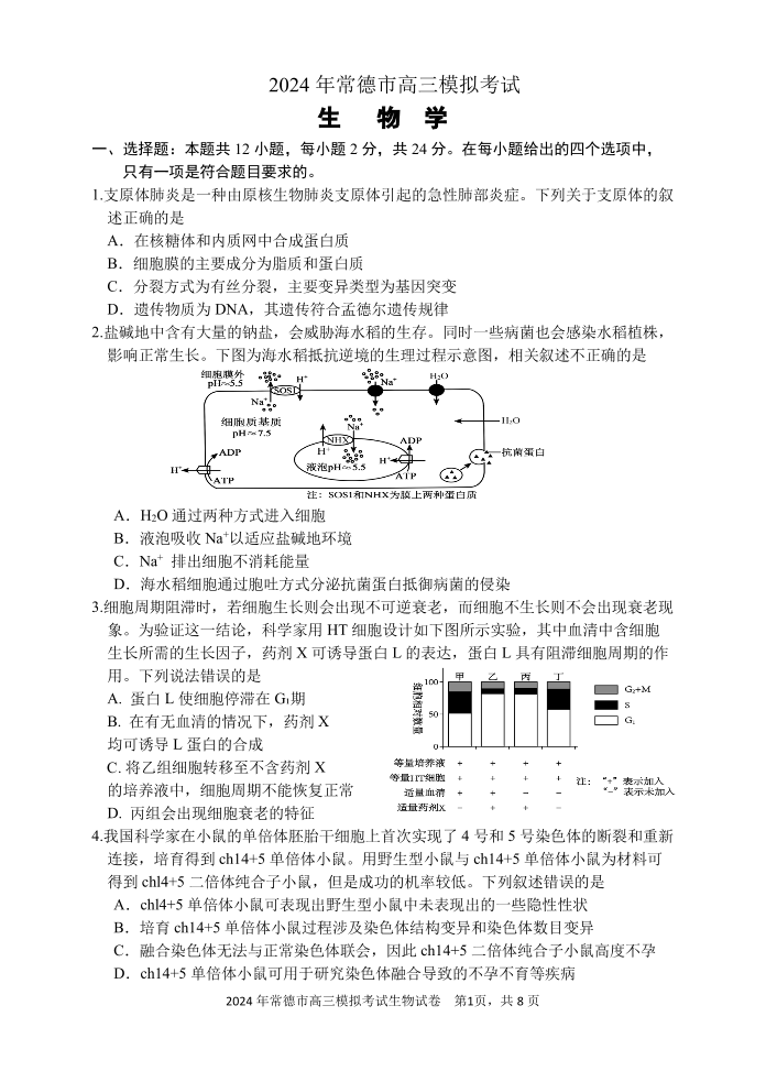 湖南省常德市2024届高三下学期3月模拟考试生物