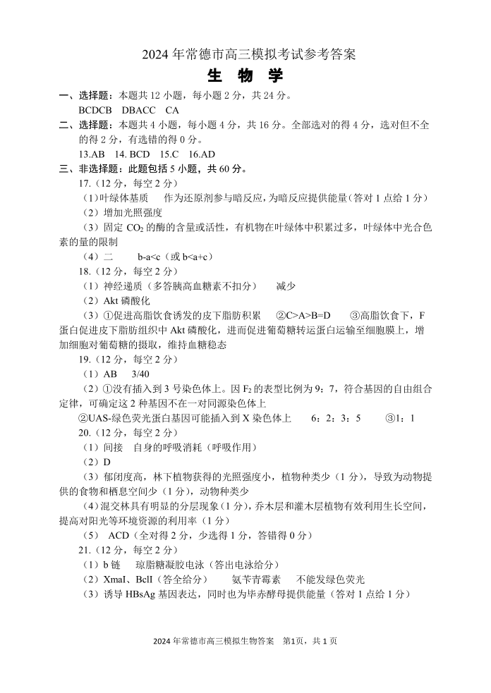 湖南省常德市2024届高三下学期3月模拟考试生物答案