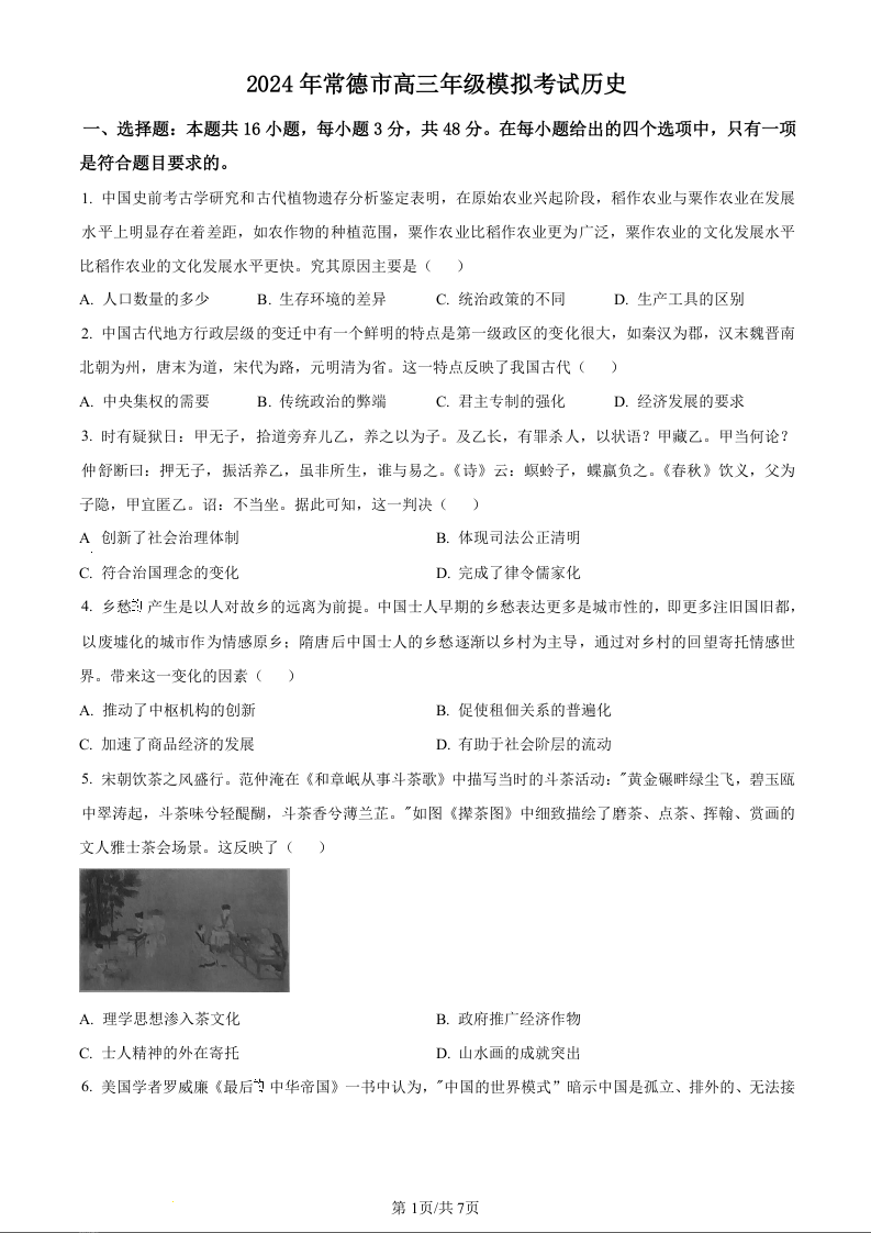 湖南省常德市2024届高三下学期3月模拟考试历史(原卷版)