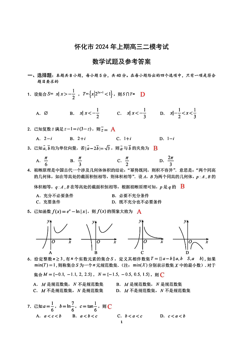 湖南省怀化市2024届高三下学期第二次模拟考试(怀化二模)数学答案