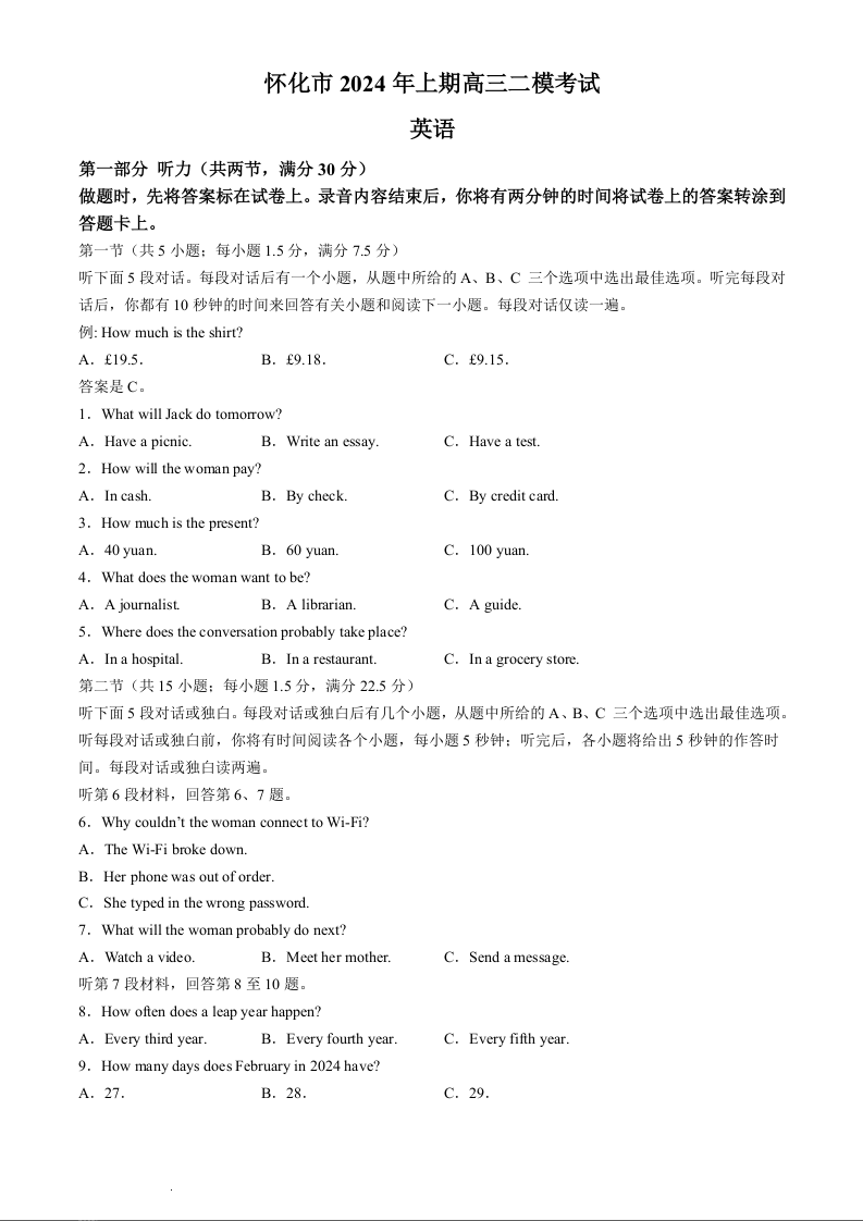湖南省怀化市2024届高三下学期第二次模拟考试(怀化二模)英语+答案