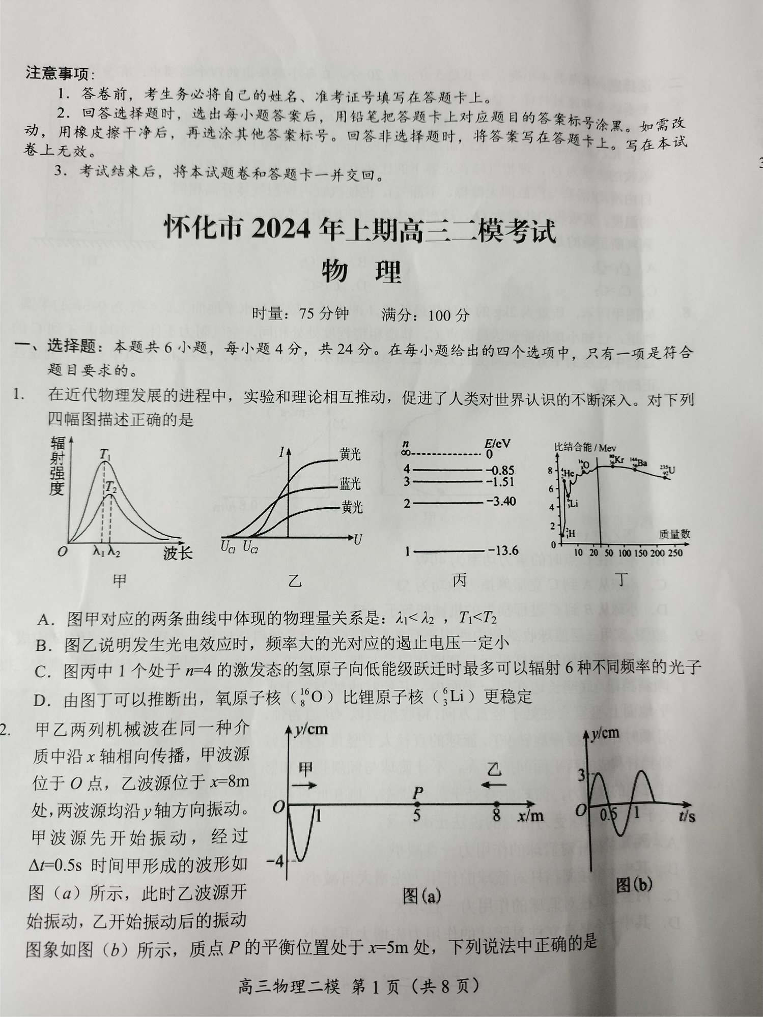 湖南省怀化市2024届高三下学期第二次模拟考试(怀化二模)物理