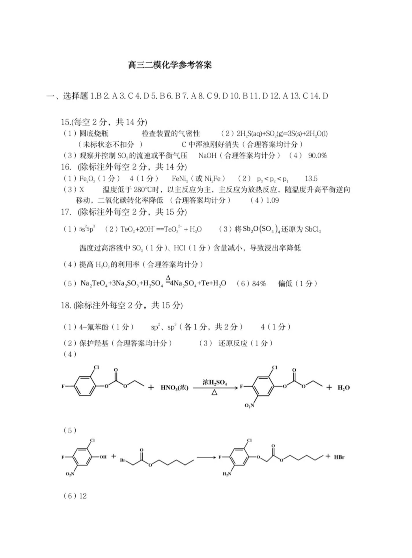 湖南省怀化市2024届高三下学期第二次模拟考试(怀化二模)化学答案