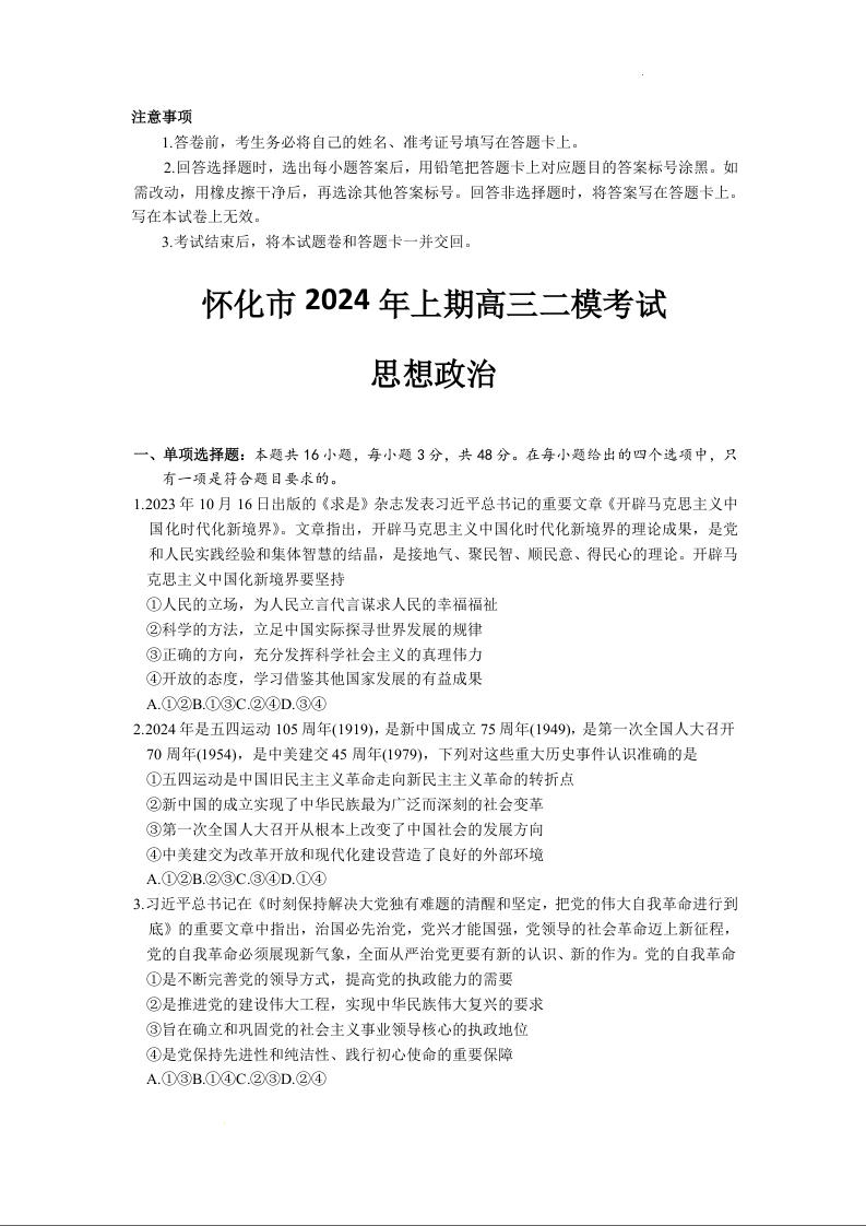 湖南省怀化市2024届高三下学期第二次模拟考试(怀化二模)政治