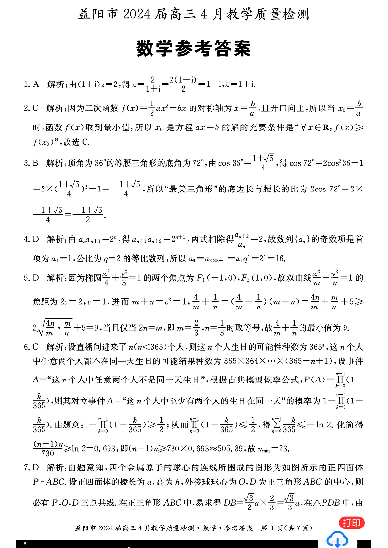 湖南省益阳市2024届高三下学期4月联考(三模)数学答案