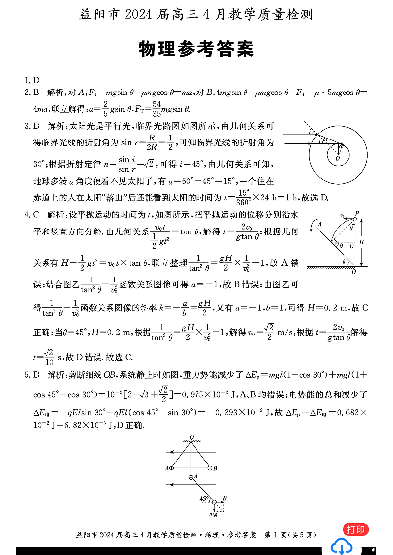 湖南省益阳市2024届高三下学期4月联考(三模)物理答案