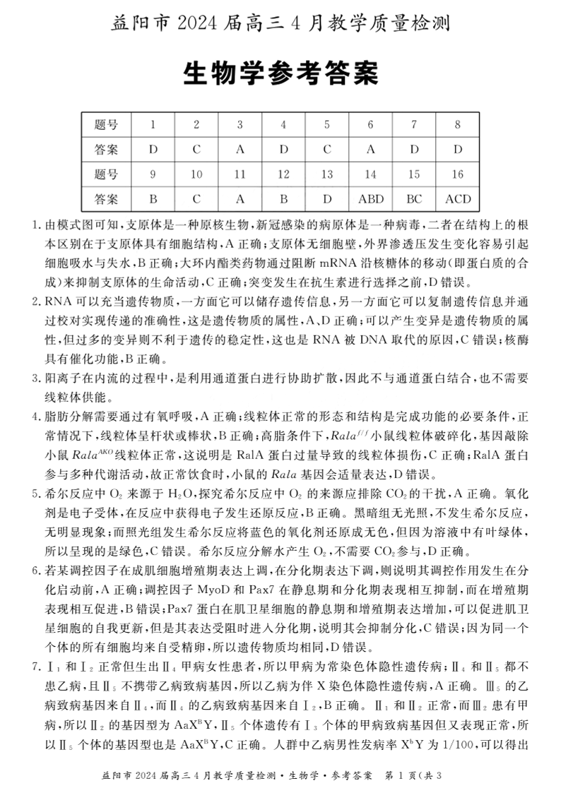 湖南省益阳市2024届高三下学期4月联考(三模)生物答案