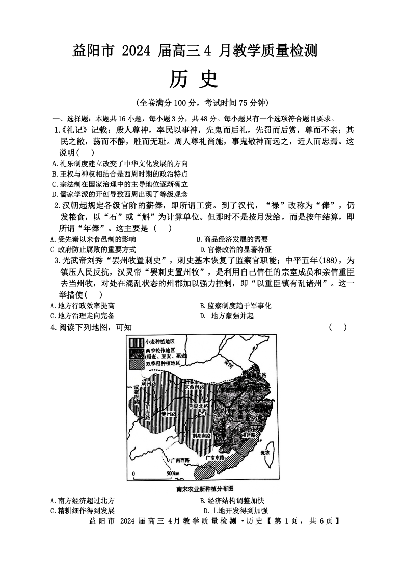 湖南省益阳市2024届高三下学期4月联考(三模)历史