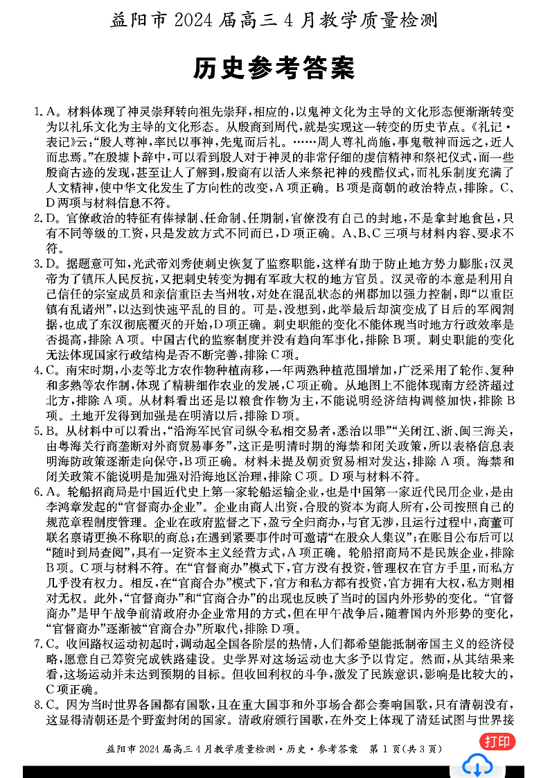 湖南省益阳市2024届高三下学期4月联考(三模)历史答案