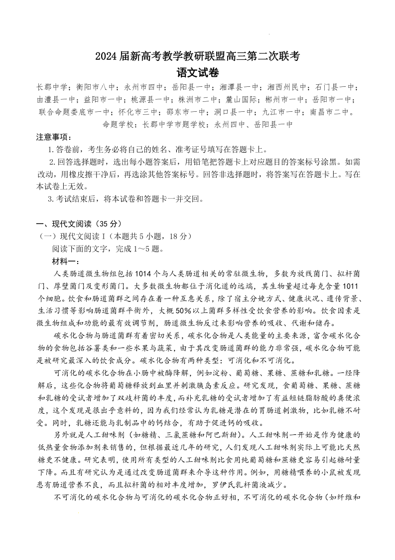 湖南新高考教学教研联盟2024届(暨长郡十八校)高三第二次联考语文+答案