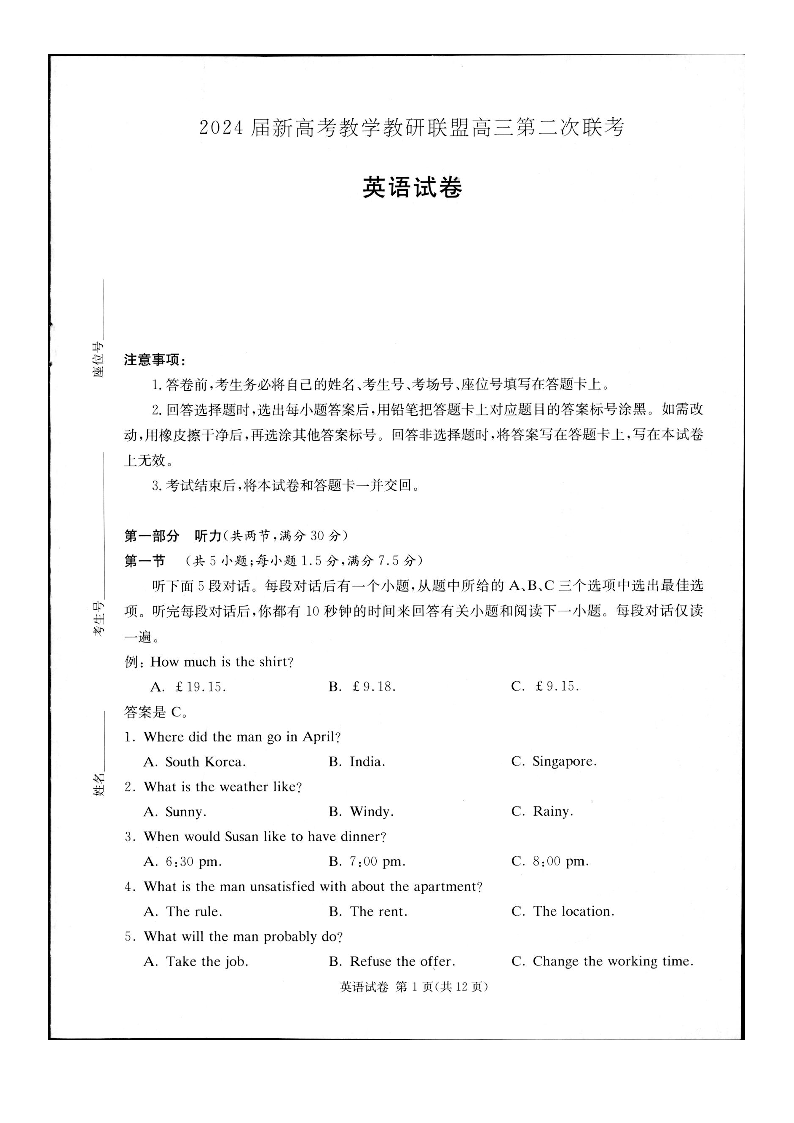 湖南新高考教学教研联盟2024届(暨长郡十八校)高三第二次联考英语
