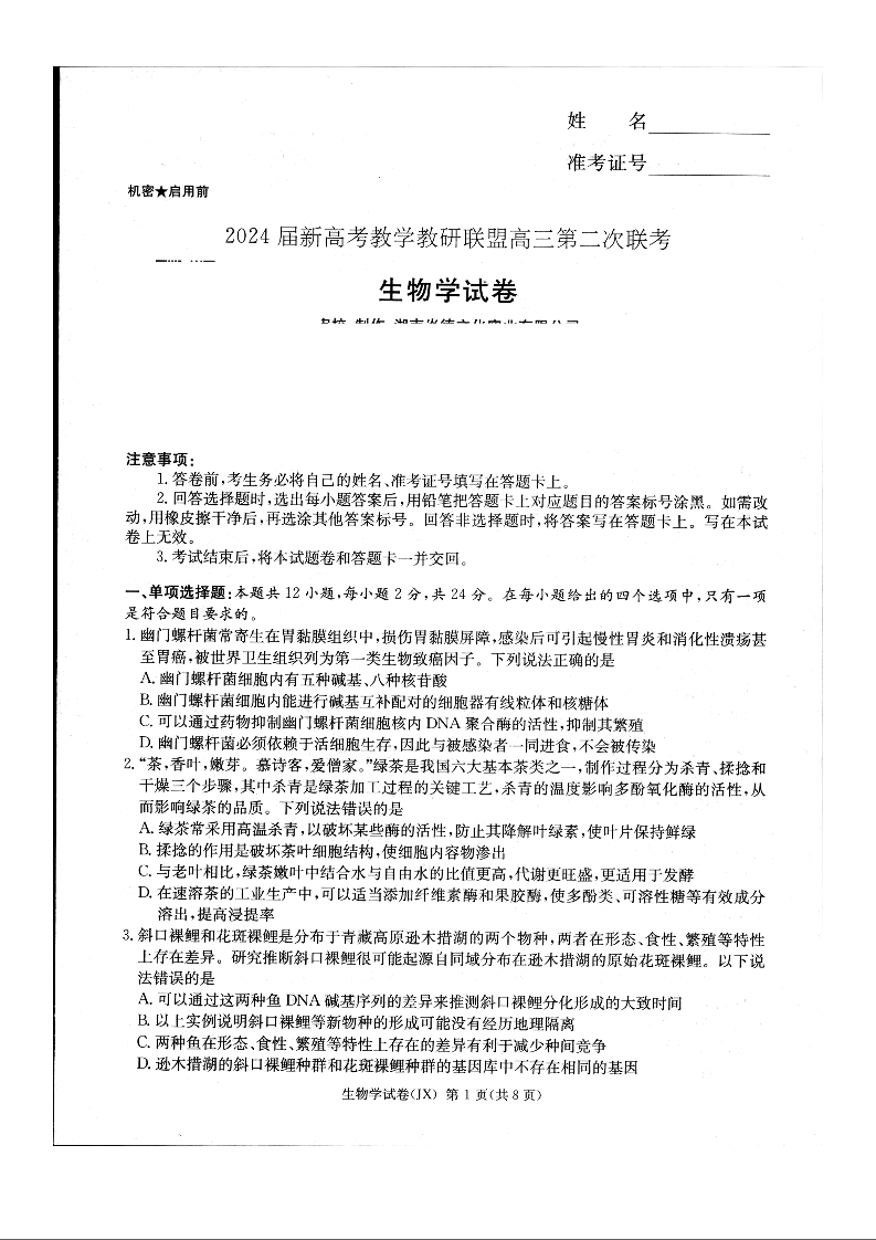 湖南新高考教学教研联盟2024届(暨长郡十八校)高三第二次联考生物