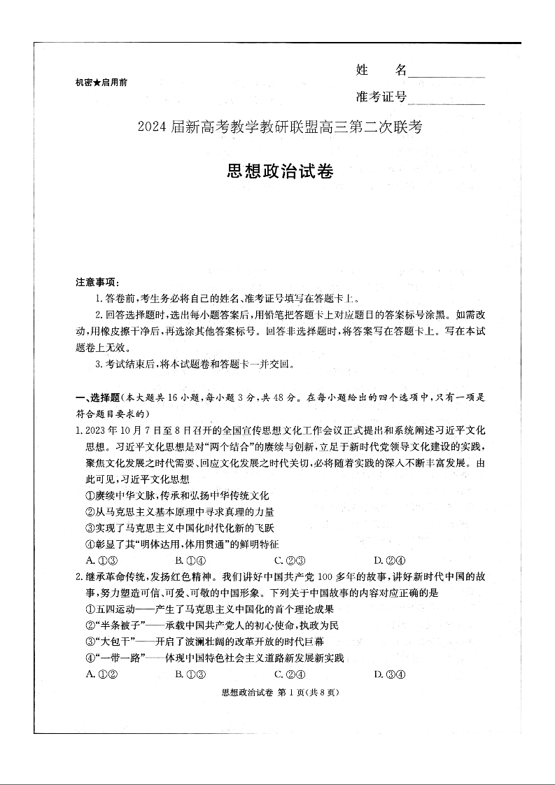 湖南新高考教学教研联盟2024届(暨长郡十八校)高三第二次联考政治