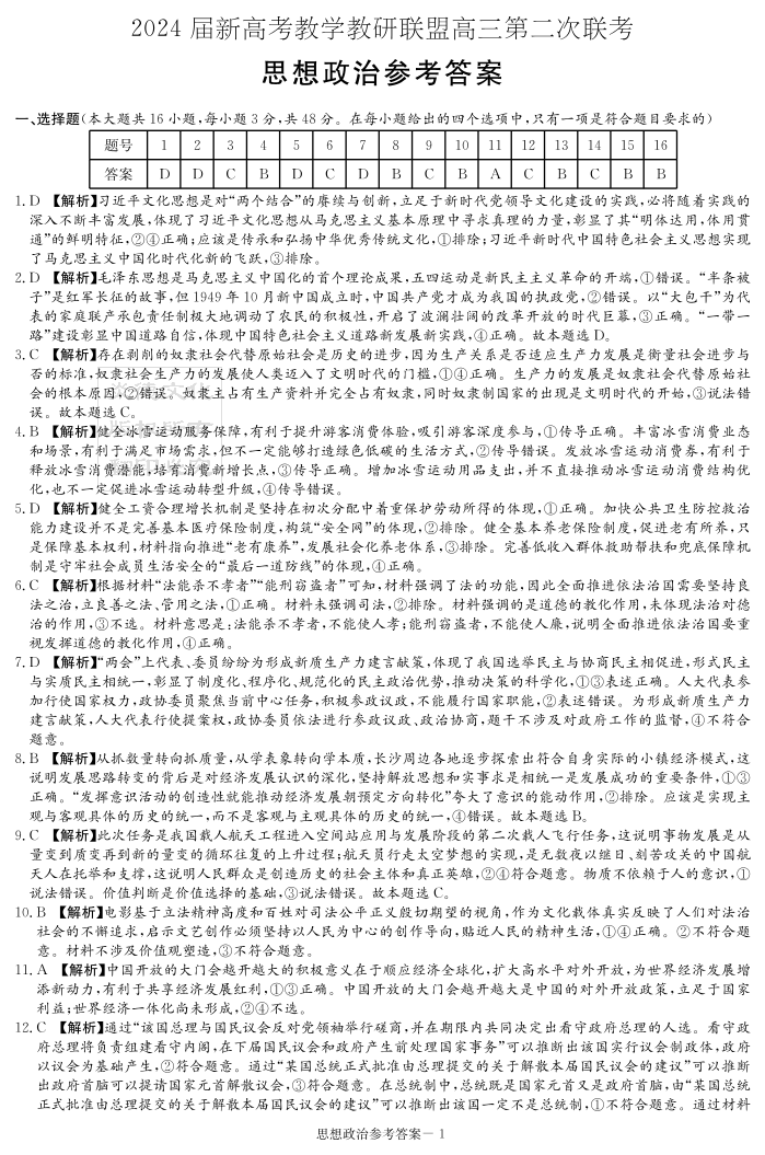 湖南新高考教学教研联盟2024届(暨长郡十八校)高三第二次联考政治答案