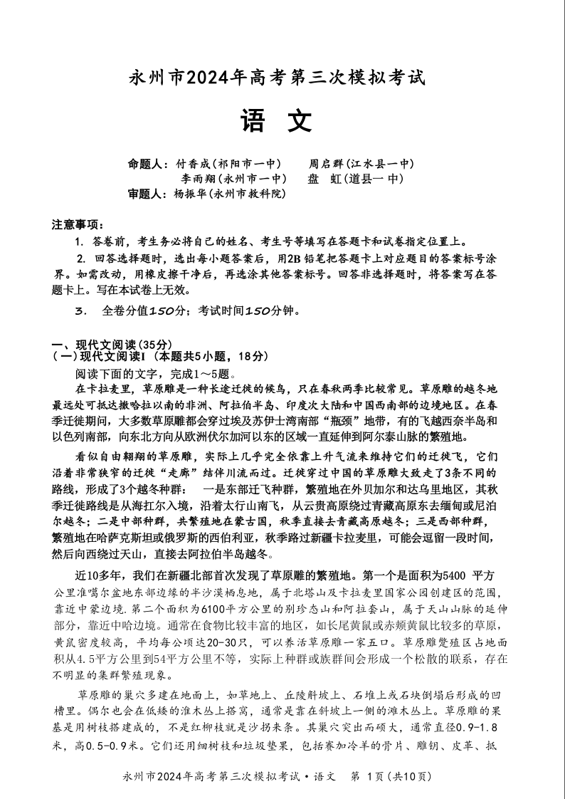 湖南省永州市2024年高三年级高考第三次模拟考试(永州三模)语文