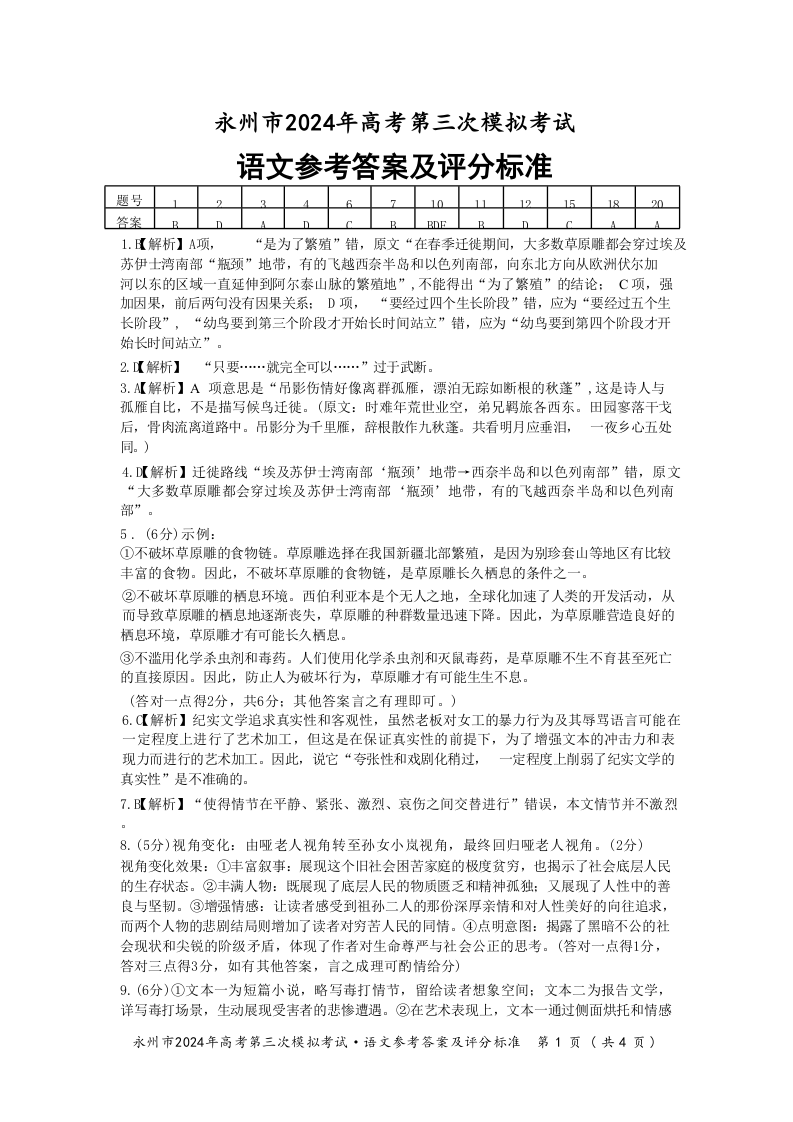 湖南省永州市2024年高三年级高考第三次模拟考试(永州三模)语文答案