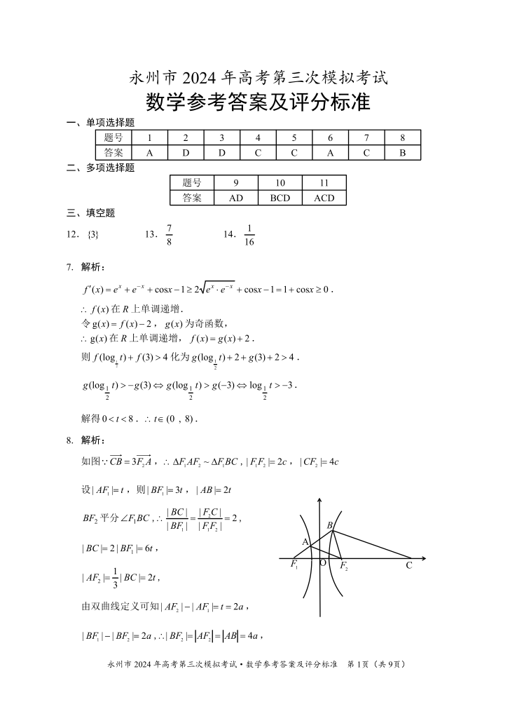 湖南省永州市2024年高三年级高考第三次模拟考试(永州三模)数学答案