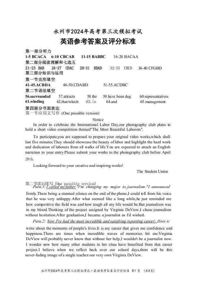 湖南省永州市2024年高三年级高考第三次模拟考试(永州三模)英语答案