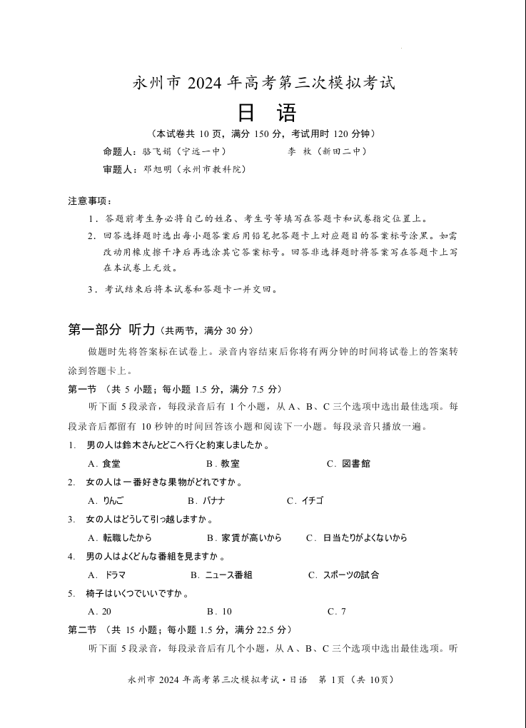 湖南省永州市2024年高三年级高考第三次模拟考试(永州三模)日语