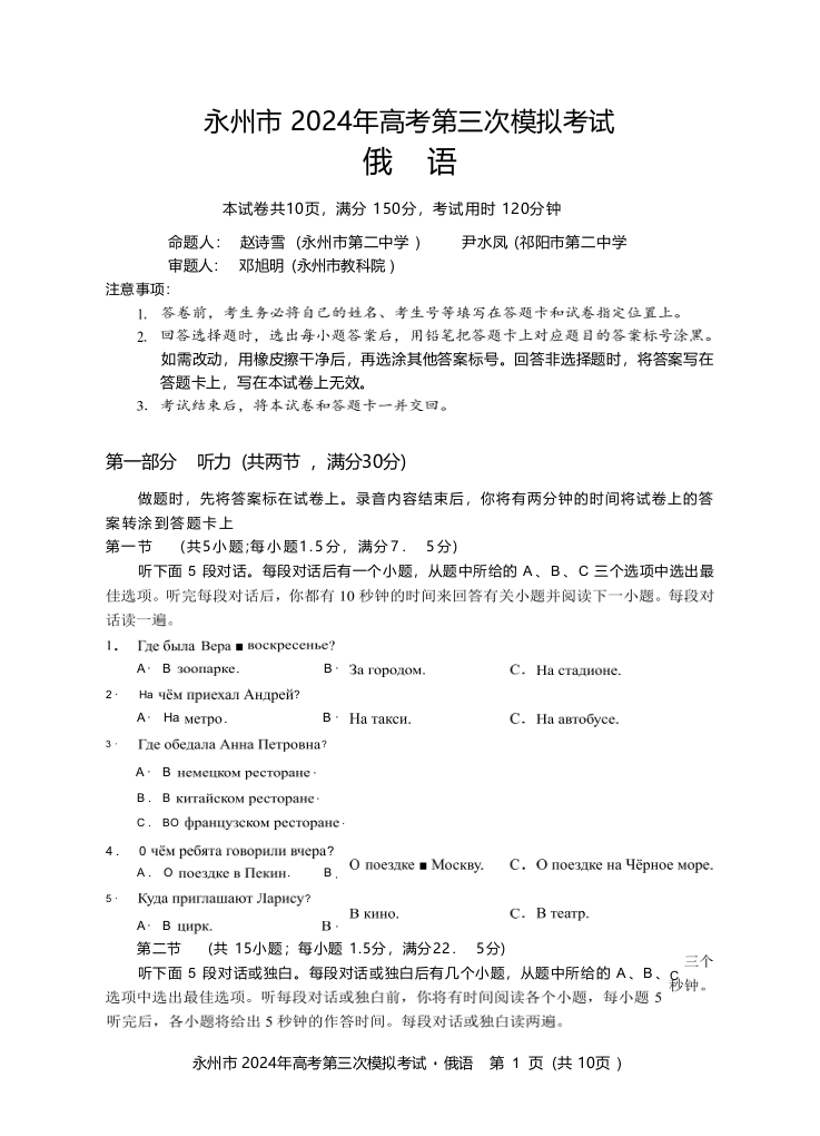 湖南省永州市2024年高三年级高考第三次模拟考试(永州三模)俄语