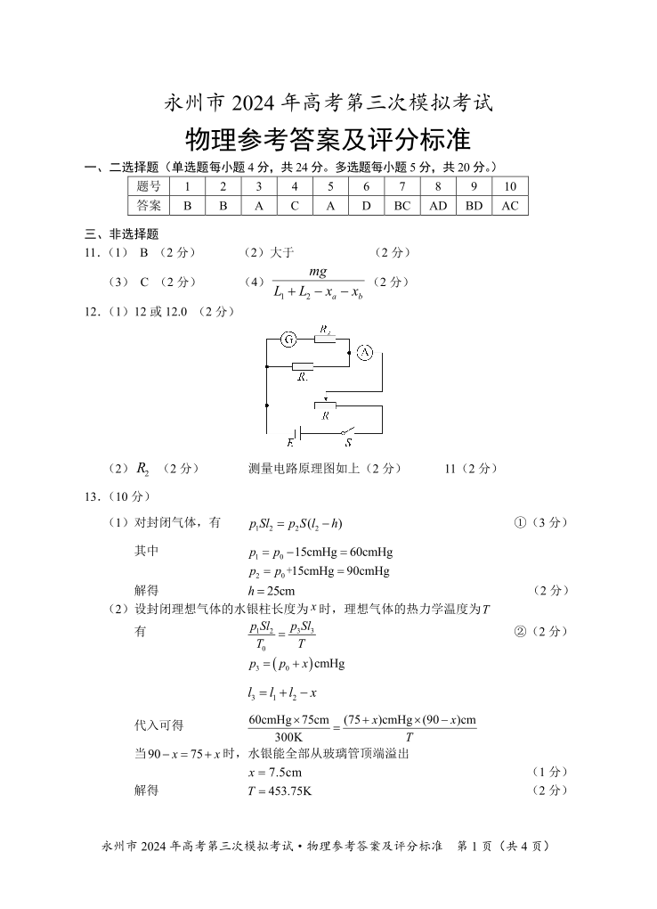 湖南省永州市2024年高三年级高考第三次模拟考试(永州三模)物理答案