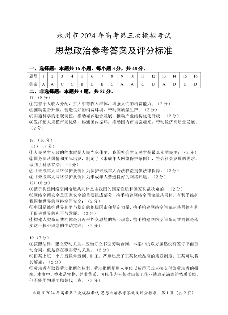 湖南省永州市2024年高三年级高考第三次模拟考试(永州三模)政治答案