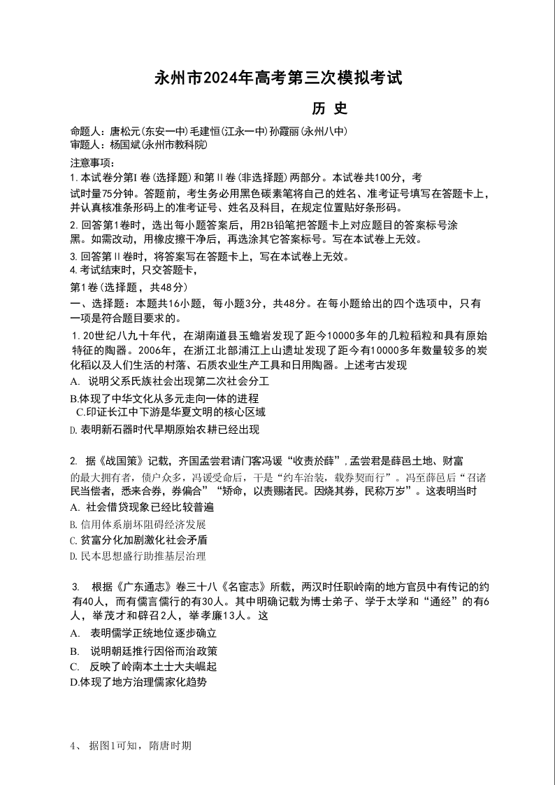 湖南省永州市2024年高三年级高考第三次模拟考试(永州三模)历史