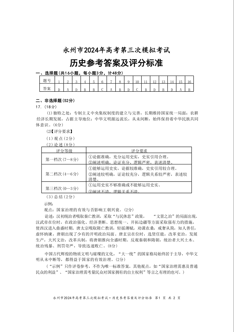 湖南省永州市2024年高三年级高考第三次模拟考试(永州三模)历史答案
