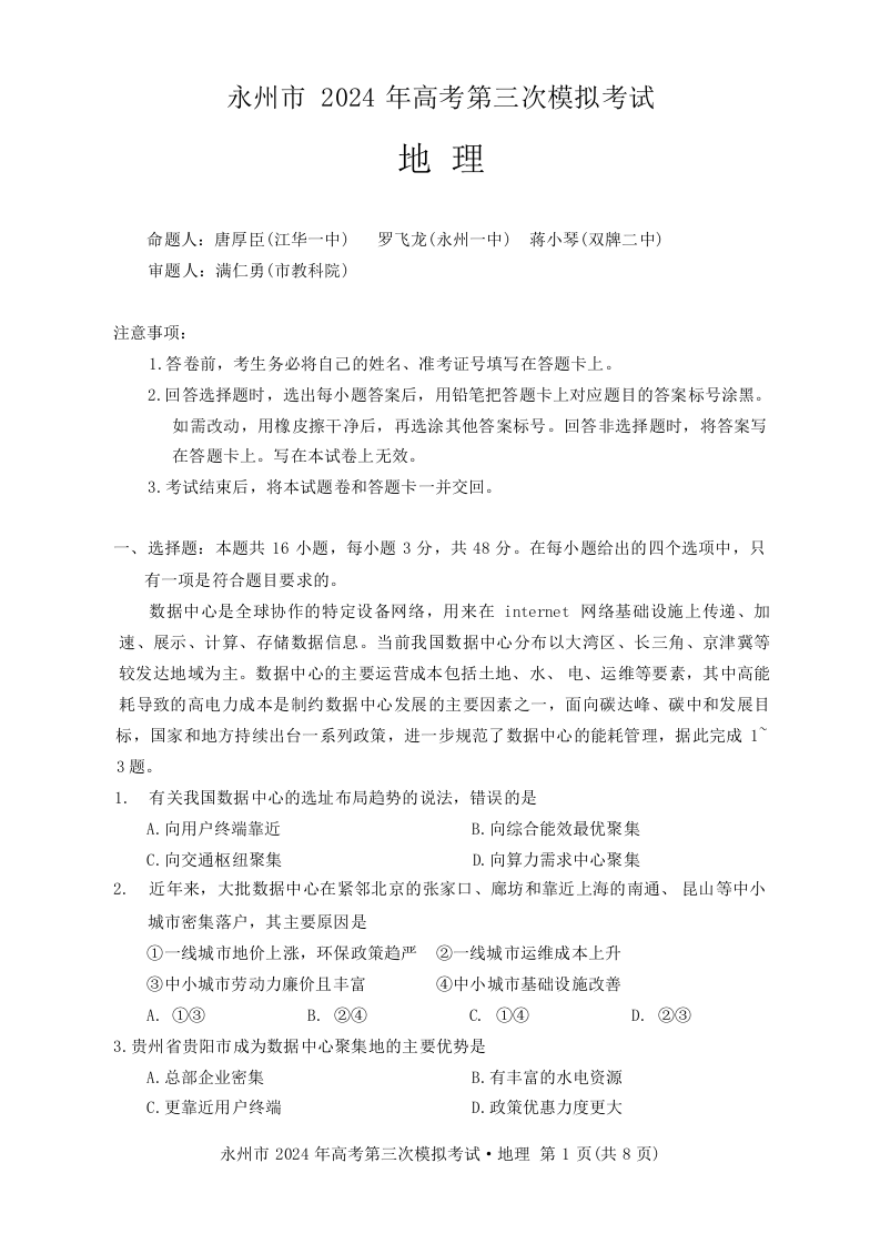 湖南省永州市2024年高三年级高考第三次模拟考试(永州三模)地理