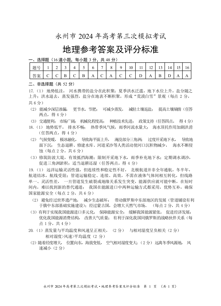 湖南省永州市2024年高三年级高考第三次模拟考试(永州三模)地理答案