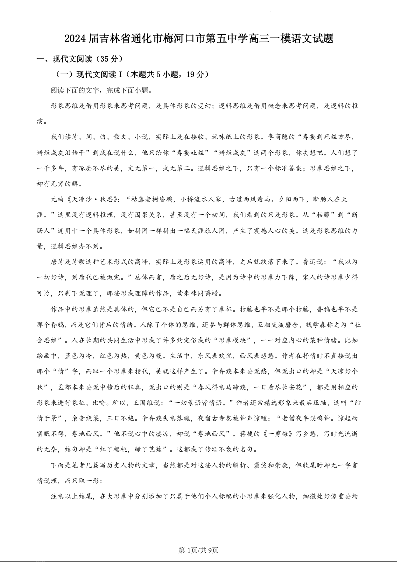 吉林省通化市梅河口市第五中学2024届高三下学期一模语文(原卷版)